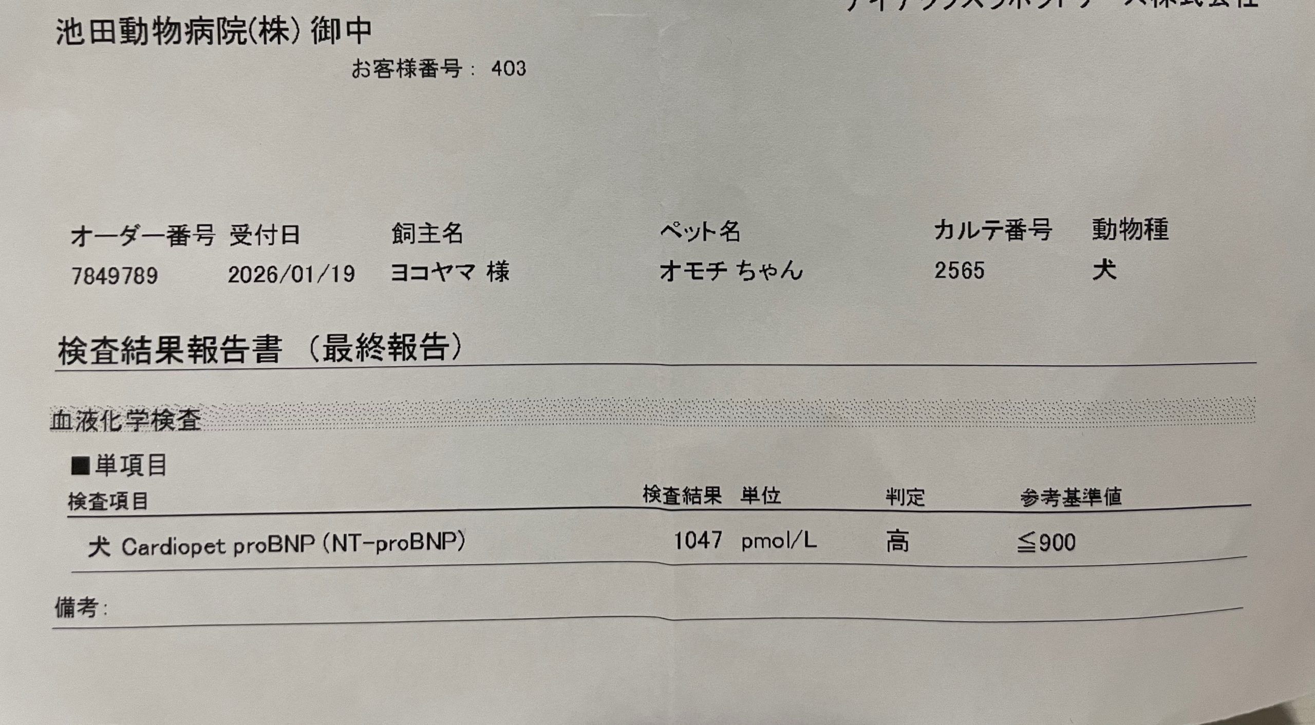 おもちは前回の採血結果とお薬。